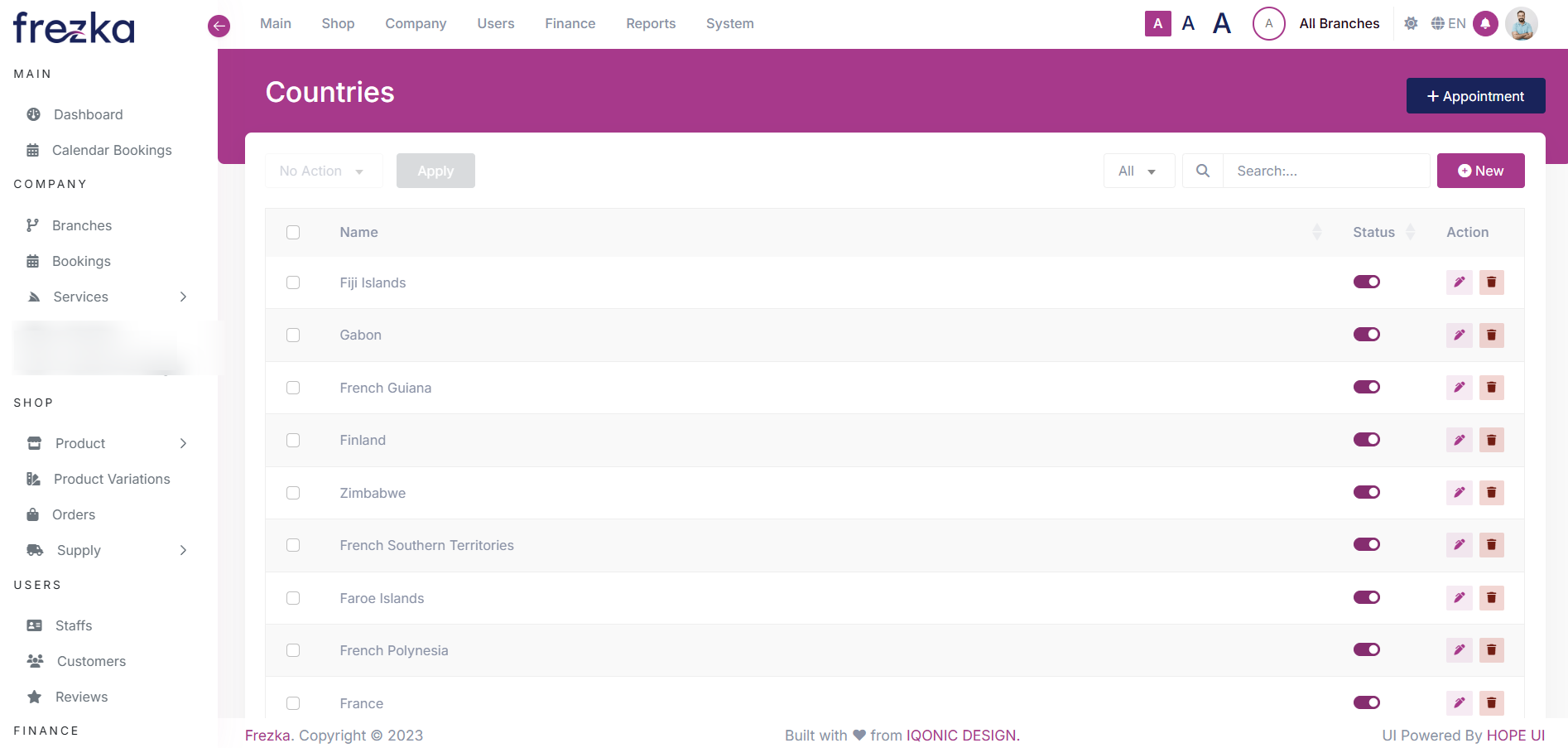 The Countries page offers a clear and concise view of all countries in your directory. It displays key details such as the country name and its current status (Active/Inactive). This page allows you to efficiently manage country records by providing options to edit or delete entries as required. The Countries page ensures that your location data remains accurate and well-organized.