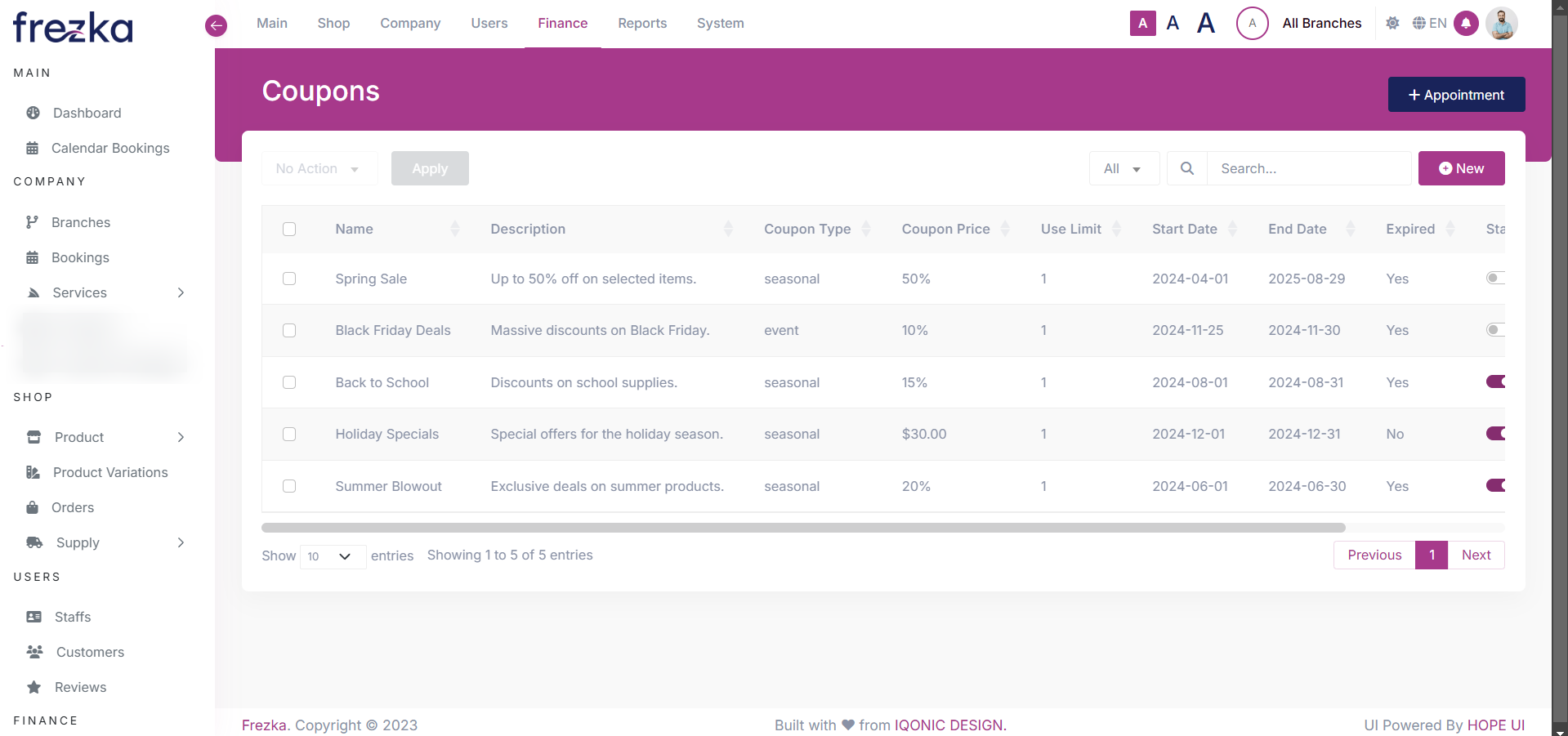 The Coupons page provides a detailed overview of all available coupons. It displays essential information such as the coupon name, description, type, coupon price, usage limit, start date, end date, expiration status, and current status (Active/Inactive). This page allows you to view detailed coupon information, edit existing coupons, or delete them if needed. Additionally, you can manage the validity and usage of coupons to ensure effective promotional campaigns. The Coupons page is designed to help you efficiently oversee and maintain all coupon-related details in one centralized location.
