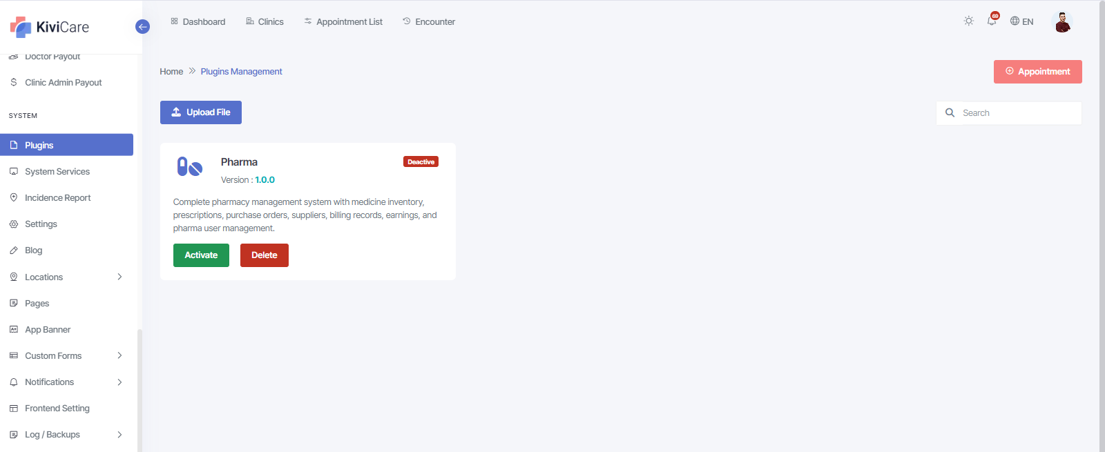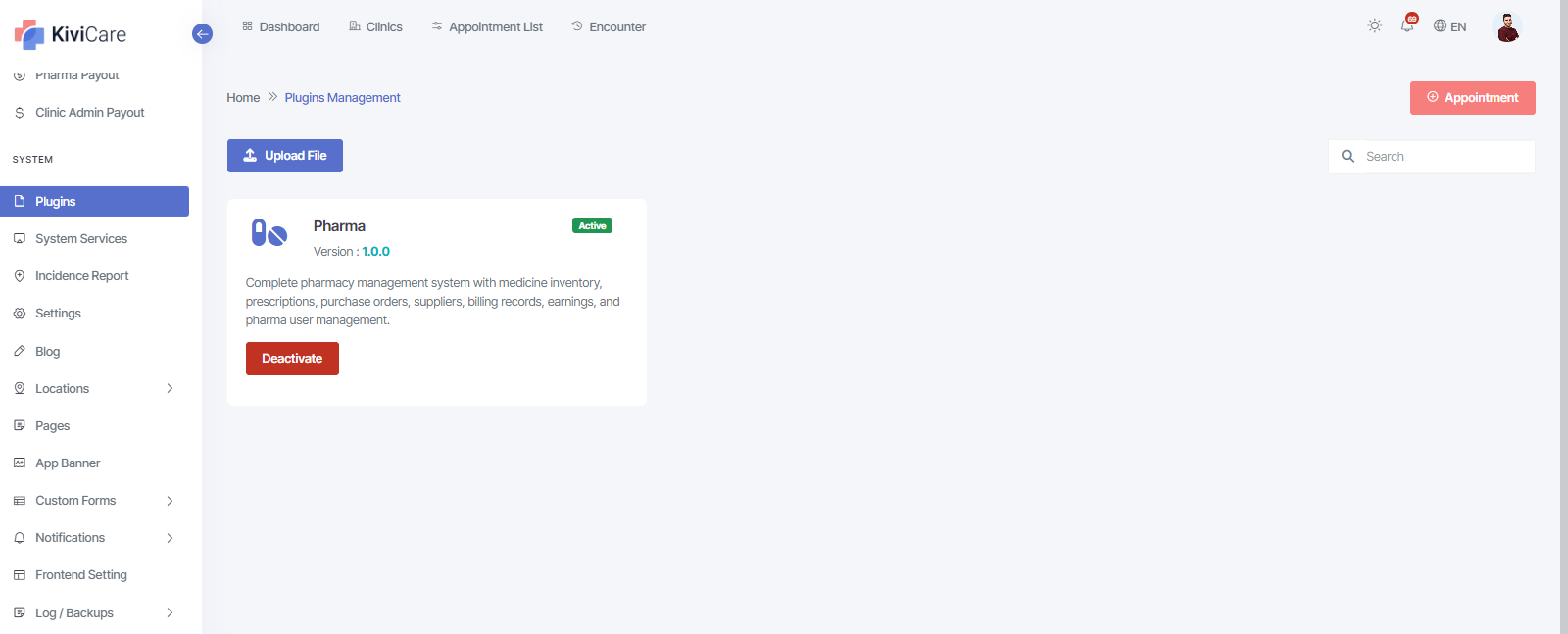 Activate/Deactivate KiviCare (TM) Pharma Addon Module From Admin Panel