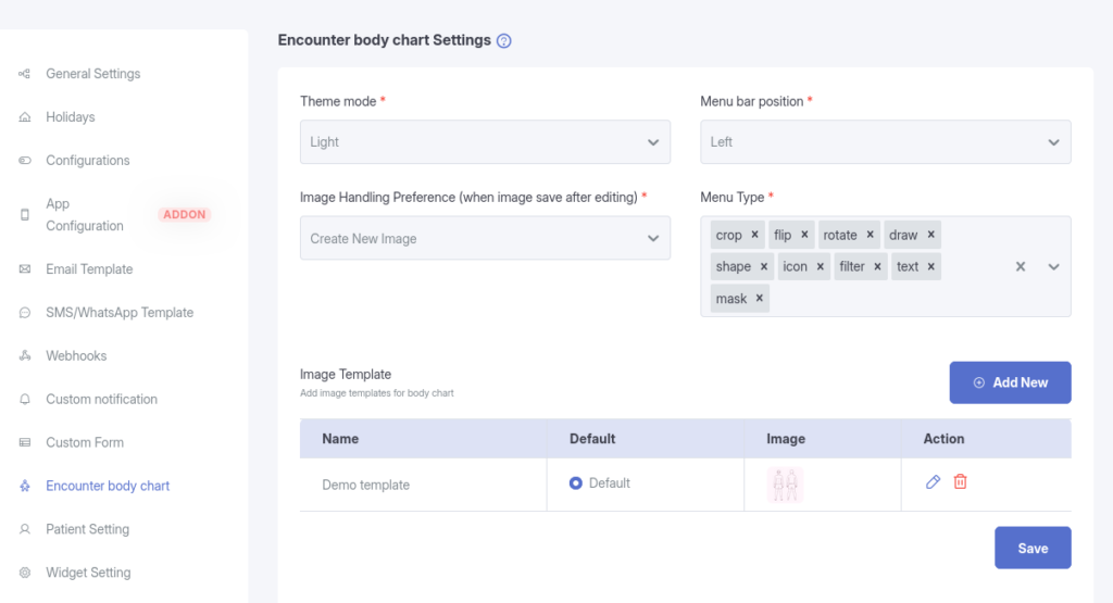 The Encounter Body Chart Settings section allows administrators to configure body chart behavior and manage templates used by clinicians.