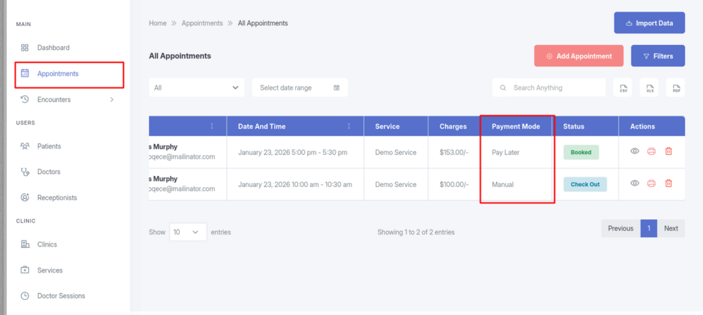 The Payment Mode column displays the payment type (e.g., Manual, Pay Later, etc.) for each appointment.