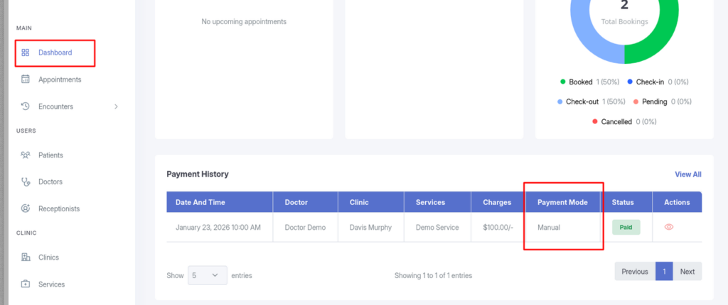 Appointments can be booked manually by Administrators, Doctors, Receptionists, and Patients. Patients can also initiate bookings directly from their dashboard.