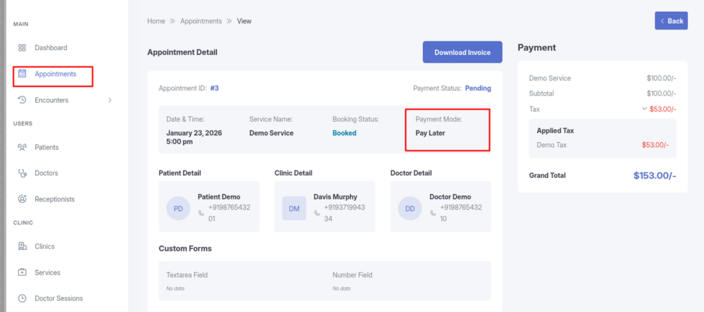 Open any appointment to view the Appointment Detail panel. The Payment Mode is listed under the appointment header.