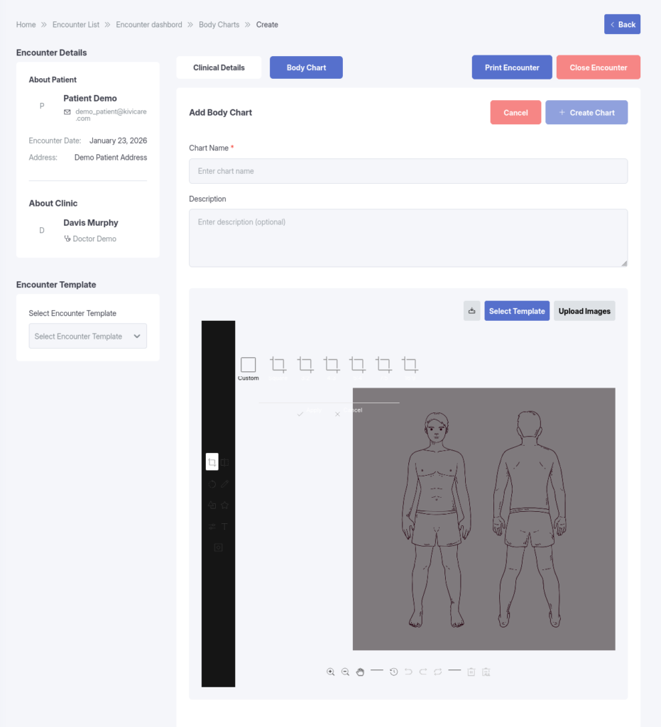 The Encounter Dashboard is divided into two primary areas to improve usability and efficiency. Description: Full-screen view of the Encounter Dashboard highlighting the left sidebar with patient and clinic details, the main workspace with the Clinical Details tab active, the top navigation tabs (Clinical Details, Body Chart), and the Close Encounter button.