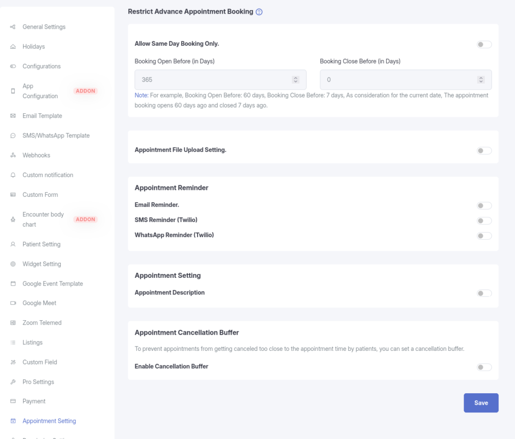 The Appointment Settings page allows administrators to control how and when patients can book appointments. It provides configuration options for booking timeframes, reminders, file uploads, cancellation rules, and general appointment behavior.