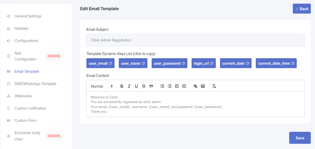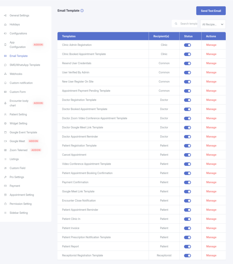 The Email Template Settings feature in KiviCare enables administrators to manage and customize automated email notifications sent by the system. This ensures clear, consistent, and branded communication with Patients, Doctors, Clinics, and Receptionists across all system activities.