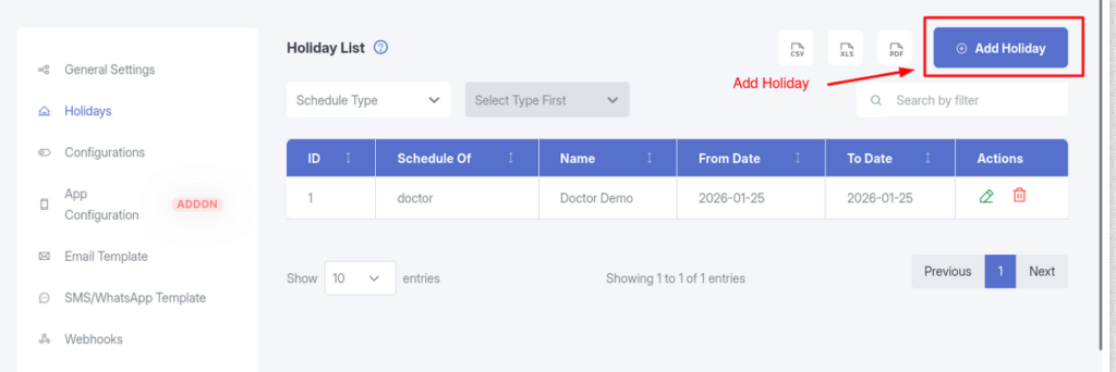 The Holidays feature in KiviCare allows administrators to manage unavailability for clinics or individual doctors. Marking dates as holidays prevents patients from booking appointments during those periods and helps ensure accurate scheduling.