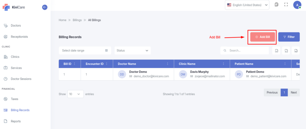 Generate Bills: Create invoices for patients based on services rendered.
