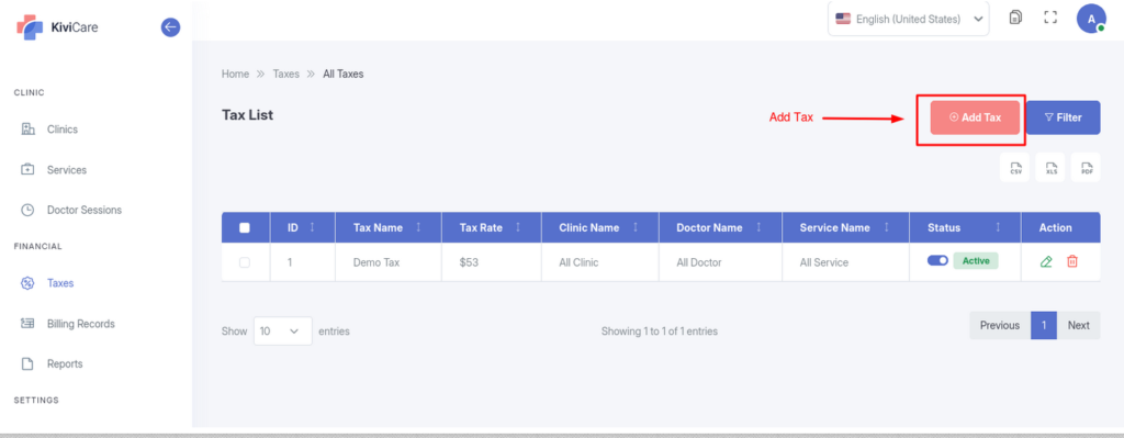 Unlike receptionists, Admins can configure the tax rules for the system. You can create, edit, or delete specific tax rates (percentages) that are automatically applied to services during billing.