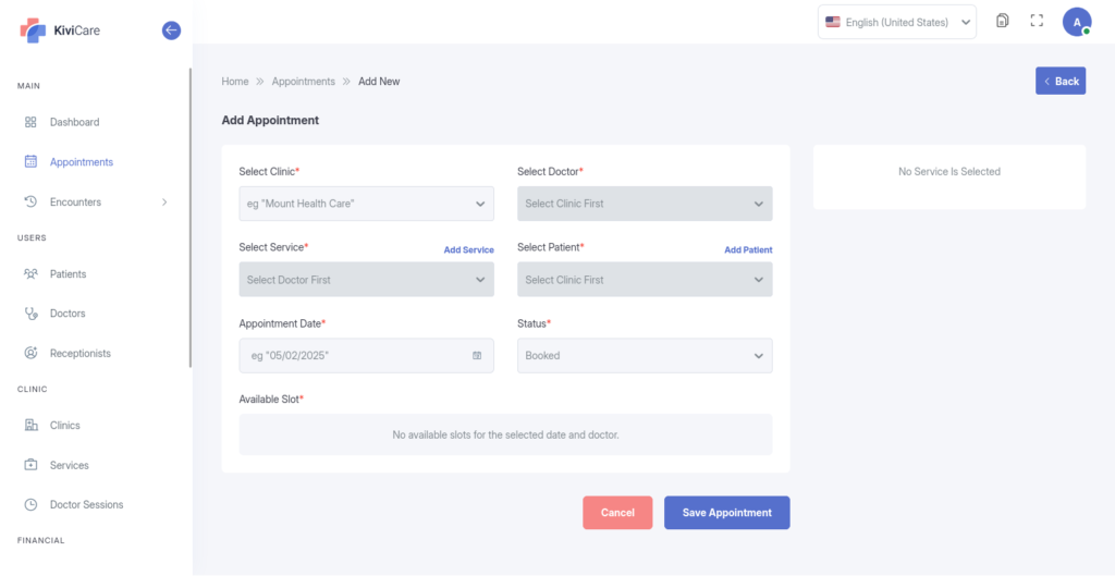 Status Control: Manually update appointment statuses to track the patient journey: Pending,Booked, Check-in, Check-out , or Cancelled.