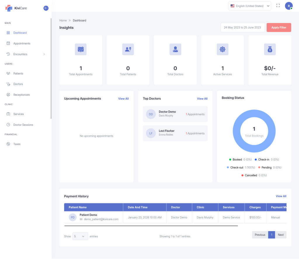 Financial & Demographic Data: Visual charts display recent Payment History and Booking Status , helping you understand your revenue flow and patient base. You can filter all these statistics by specific date ranges.