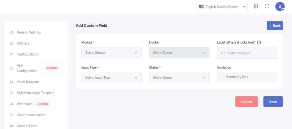 Usage: These fields will appear on patient registration forms, ensuring you capture specific data relevant to your specialty.