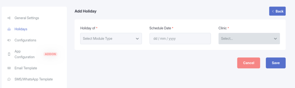 Prevent scheduling conflicts by adding clinic holidays. You can mark specific dates as “Full Day” or “Half Day” closures, which automatically blocks appointment bookings for those times.