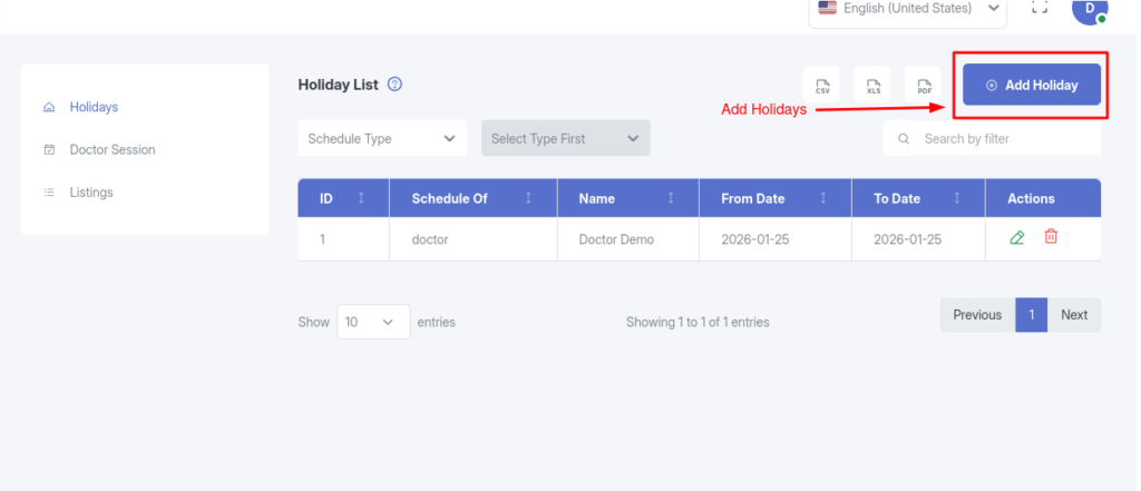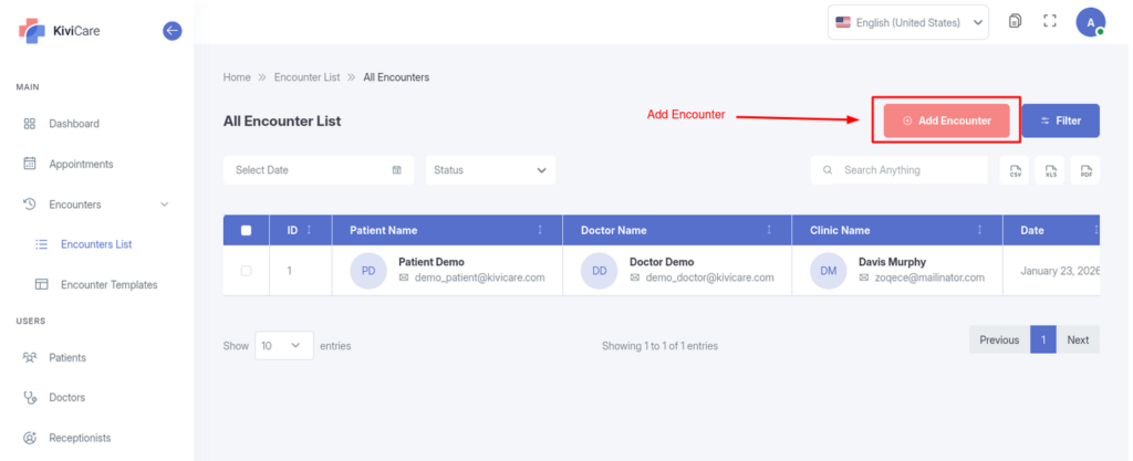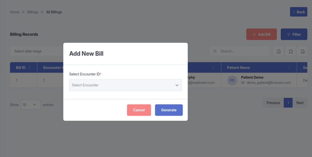 For almost every module in the system—including Patients, Doctors, Appointments, Billing, and Encounters—you have the ability to import and export data. You can download lists and records in CSV,Excel or PDF formats, which is useful for monthly reporting, external accounting, and data backups.