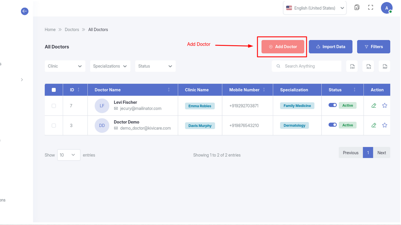 Onboarding: You can add new doctors to the system, inputting their specialization, qualifications, and assigning them to a clinic.