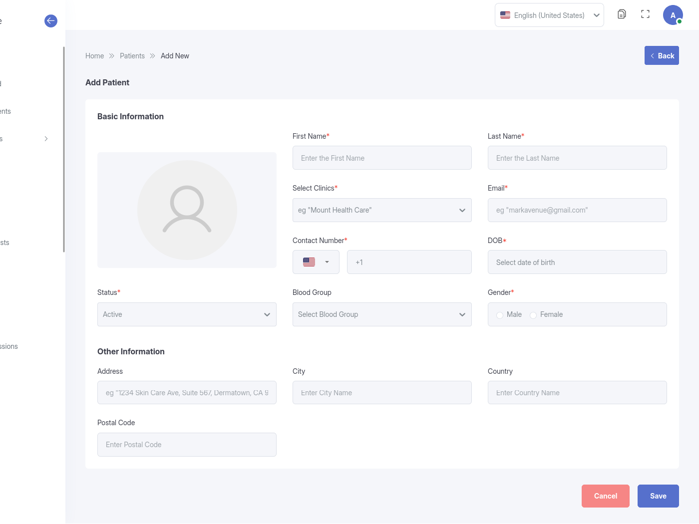 Registration: Add new patients by entering their personal details, contact information, emergency contacts, and insurance data.