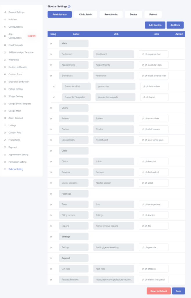 The Sidebar Settings feature allows administrators to customize the main navigation menu for all user roles, including: