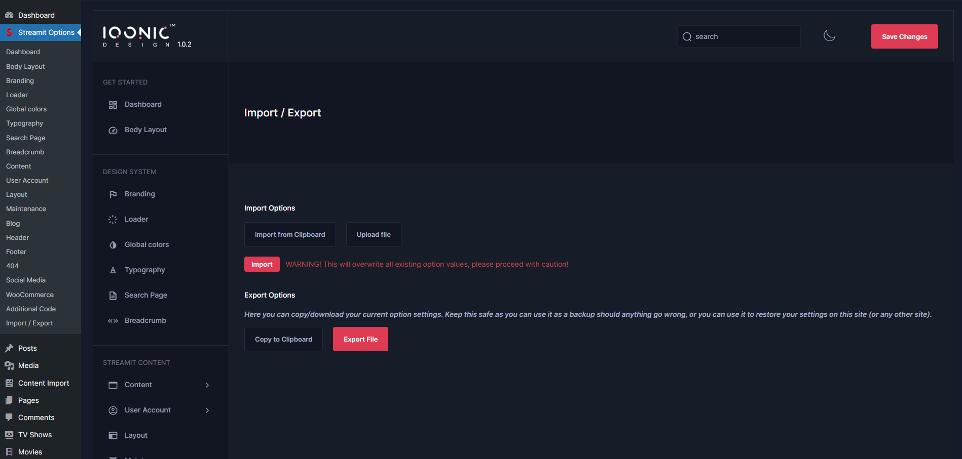 You can import or export theme settings from here. This will be useful when you are developing your site on other server and want to move only theme settings. Just click “Download” button to export the settings and click “Import from file” button to import it.
