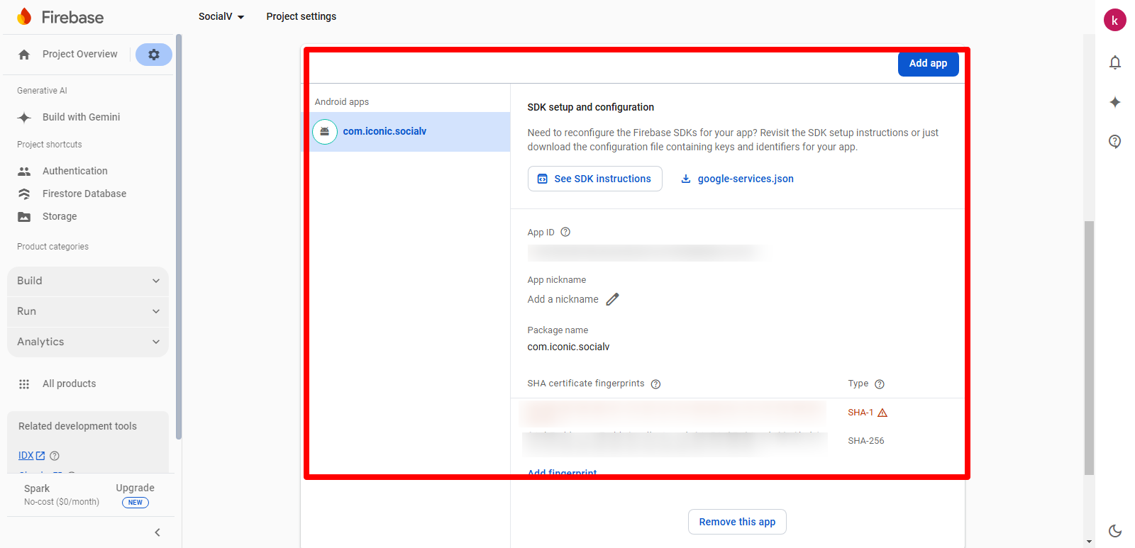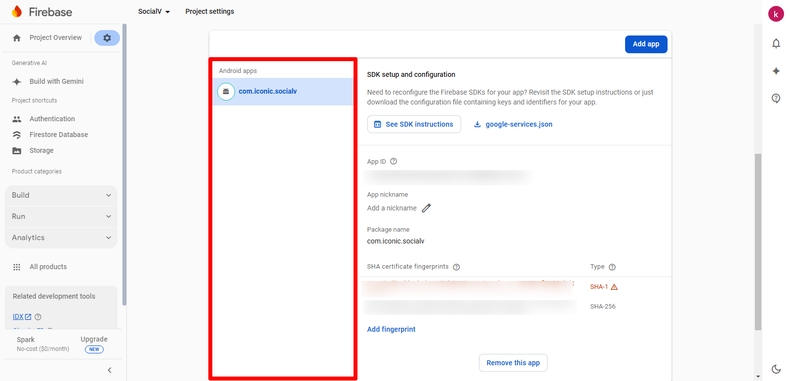 2. Select the Firebase Android app to which you want to add a SHA fingerprint