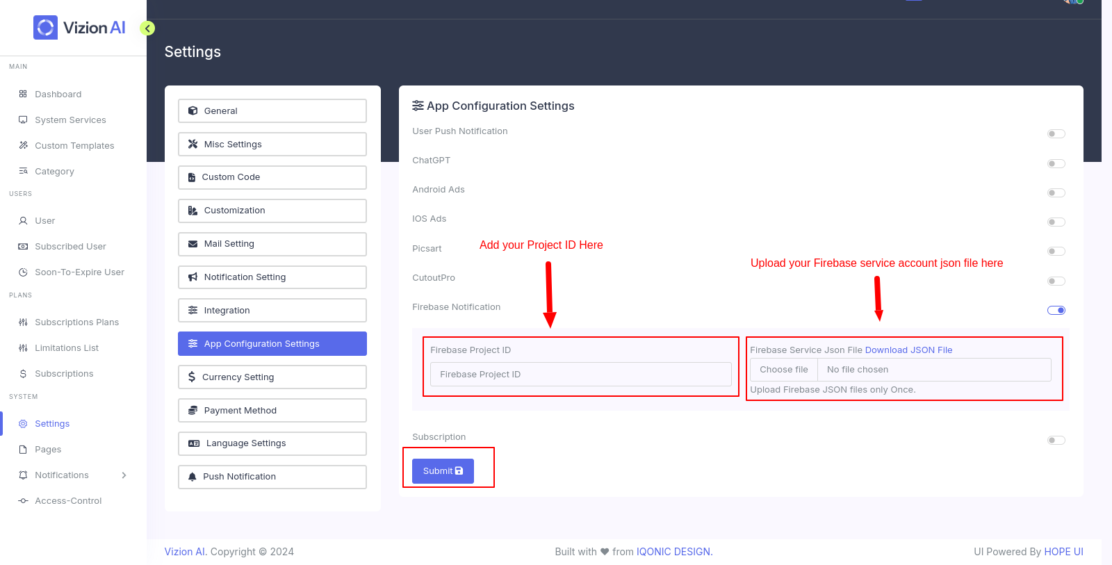 Add Firebase Project ID and Service Account Json file to Admin Panel
