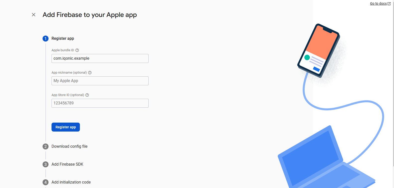 2. Enter Package Name (e.g., com.iqonic.example) and click on register app.