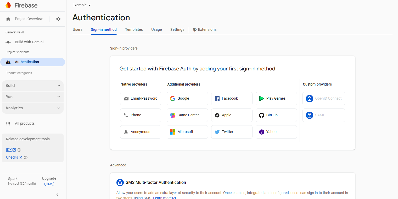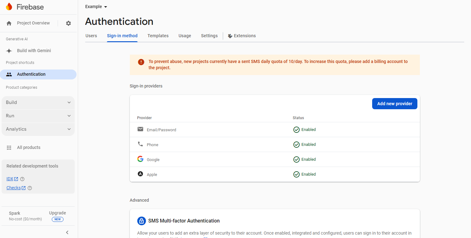 2. Then select the Email/Password, Google, Apple, and Phone Number one by one and enable them.