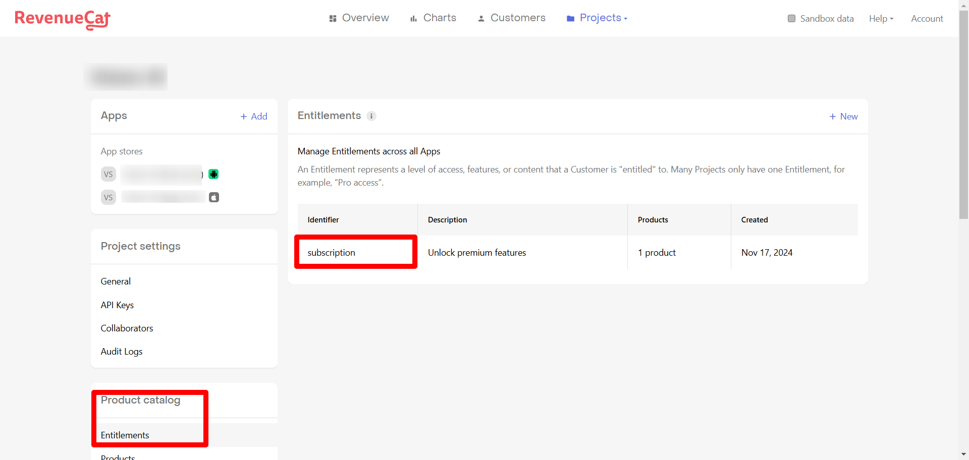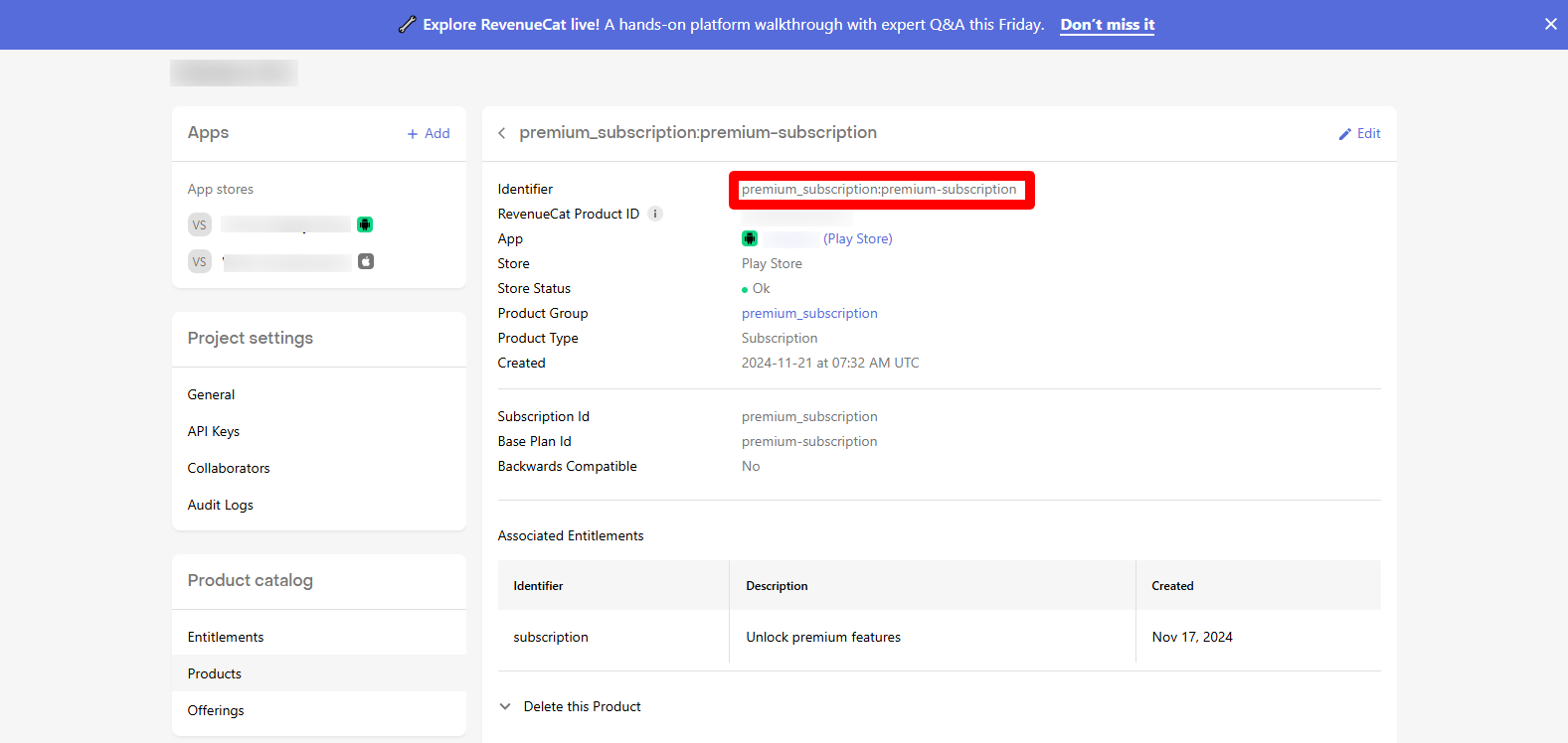 • For “Entitlement Identifier” , go to RevenueCat dashboard and click on “Entitlement” menu from “Product Catalog”