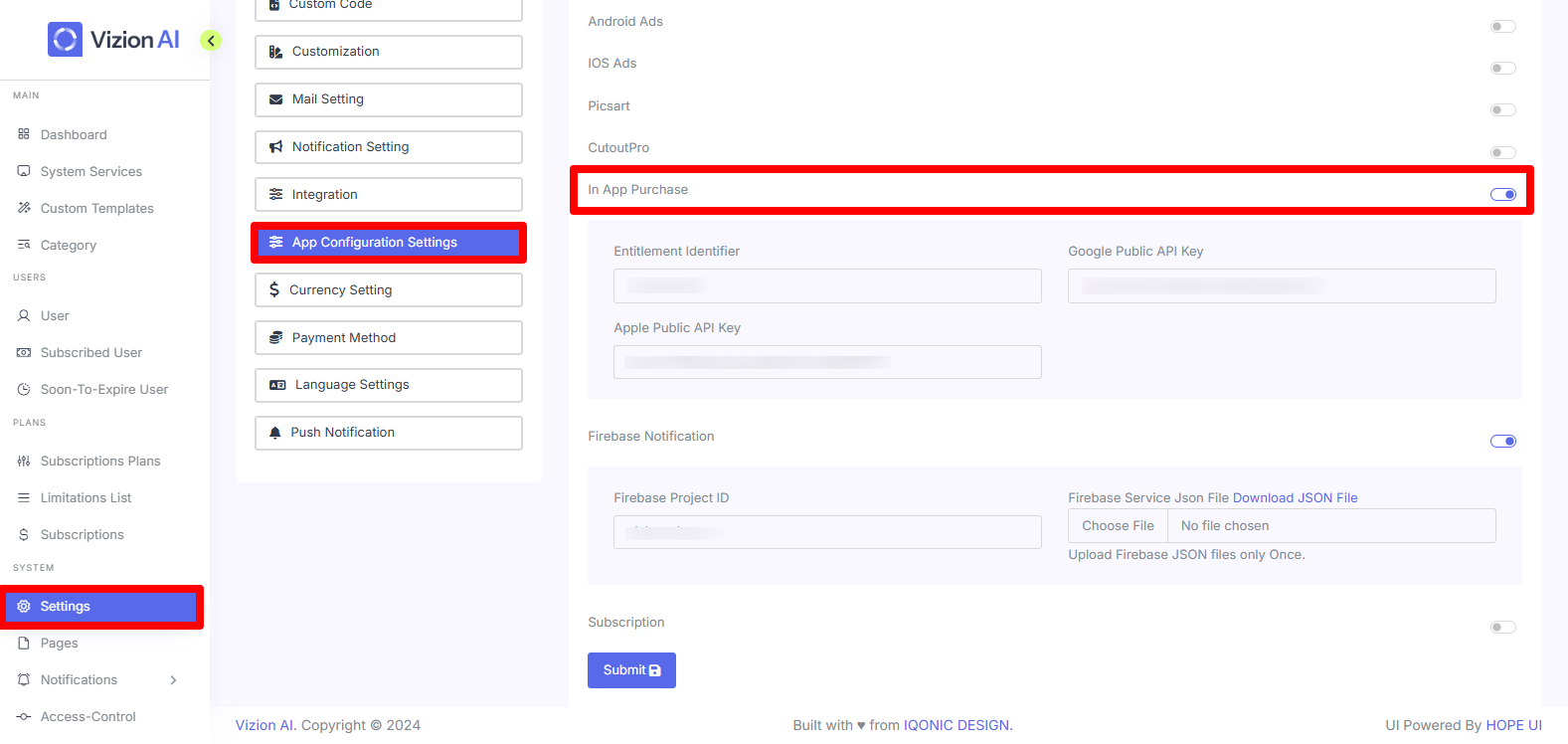 • For “Google Public API Key” and “Apple Public API Key” fields, go to RevenueCat dashboard and click on “API Keys” menu from “Project Settings” section.
