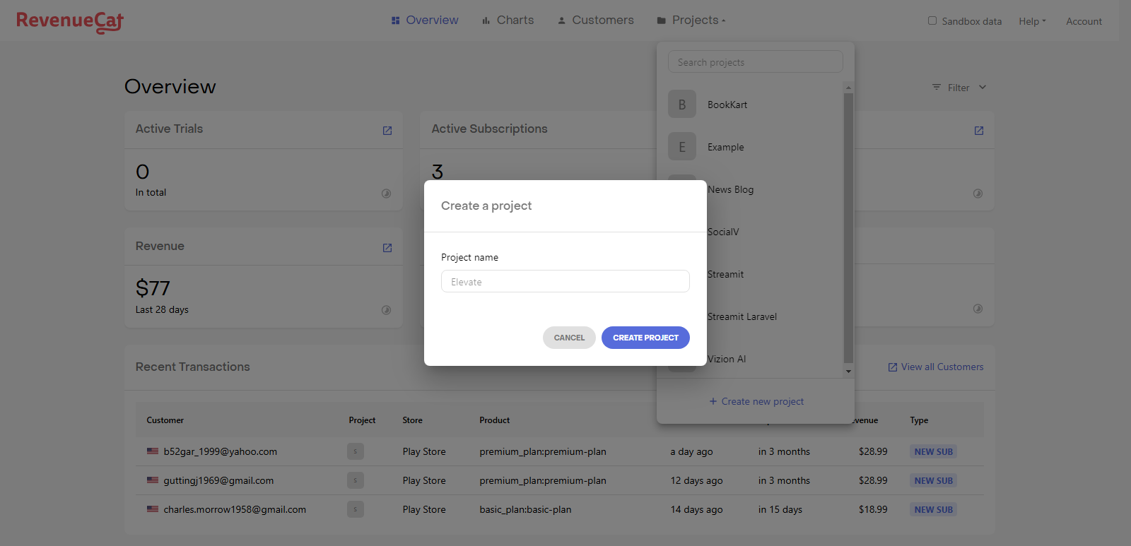 • In the RevenueCat dashboard, click on “Projects” menu and click on “create a new project” button for your application.