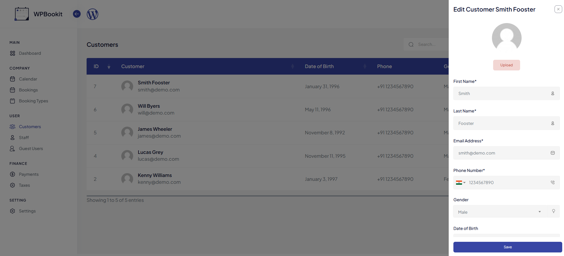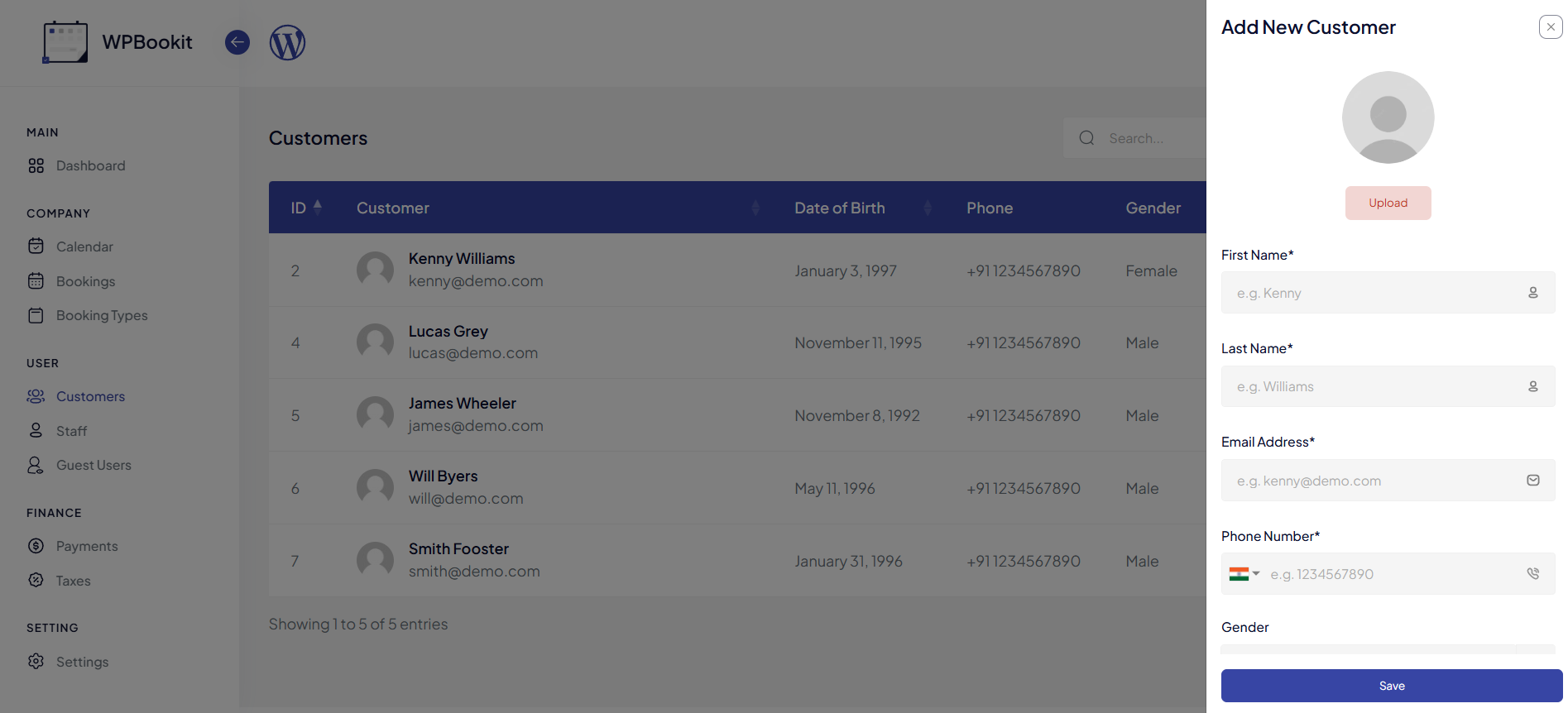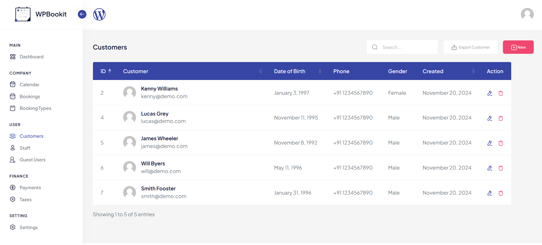 The “Customer” section in WPBookit allows you to view and manage customer’s information. You can add new customers, edit existing customer details, and delete customers. This section also provides an option to export the customer list, you can also search using customer information.